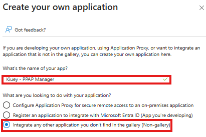2.3 Add Application Name (Example: Kiuey-PPAP Manager) Then select Integrate anyother application you don't find in the gallery (Non-gallery), Click Create.