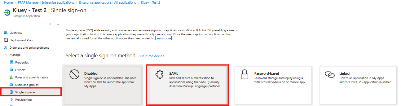 3. Once in the Kiuey Application page, go to the sidebar, then to Manage > Click on Single sign-on, then select SAML: